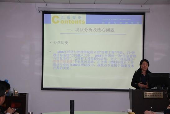 我院朱建军副院长致欢迎辞,并向评审专家详细介绍了学校本科专业建设的背景。信息管理与信息系统专业负责人马静老师从专业发展规划、专业建设方案、实施计划与经费预算等方面向与会专家做了全面的汇报。方案提出信息管理与信息系统专业建设应以学生编程能力提升为基础、以数据抓取、数据分析能力提升为切入口,紧密联系当前大数据发展趋势,打造南航特色的信息管理与信息系统专业。电子商务专业负责人陈晔老师重点从学生实践能力提升角度,提出电子商务专业建设应以课程体系优化、实验教学有效对接电子商务实践为提升切入口,紧密联系当前电商迅猛发展趋势,建设南航特色的电子商务专业。