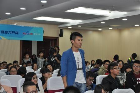 主持人简短开场及嘉宾介绍后,周德群院长致辞,周院长通过互联网对当今时代的影响,强调了搜索引擎的重要性,鼓励经管学子积极参加大赛,培养自己综合素质,为未来互联网行业储备人才积蓄力量。接着,段建总裁发表了热情洋溢的演讲,分别用“从‘商’的角度看百度”、“搜索引擎是一扇打开认识百度的大门”和“90后应该到最激情、最市场、最创新的行业去奋斗”三句关键语阐述,提出在营销方面,企业应从千千万万潜在用户中寻找销售对象,并对百度产品做了简单介绍。之后,百度首席讲师刘伟风趣幽默的向在场学生讲述了大数据时代的营销变革。他以自己的人生经历作为开头,讲述从安稳的政府工作单位跳槽至互联网行业的初衷,并用百度大数据的挖掘与对比、数据的分析与预测向大家展示了互联网时代大数据的价值与实用性,其列举了百度筷子、百度广告精准营销策略,给大家带来了极大的震撼,讲话的最后,他提出百度营销大学是为了向社会推广营销理念和培养互联网人才,指出它包含“师资培训”、“学生实训”、“竞赛”和“实习/就业”四个部分,鼓励大学生积极加入百度营销大学。宣讲会尾声,刘全力先生简洁明了地为大家介绍了营销大赛的背景、目标、组织结构和参赛时间等,并与现场观众互动答疑。