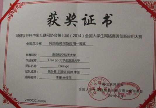 信息管理与信息系统专业学生姚叶慧、王颖钏、闫帅和电子商务专业学生李坚同学组成的“Free Go”团队获得总决赛一等奖。