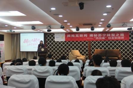 承办,苏宁企业俱乐部协办。苏宁云商南京大区副总经理邹冬萍、都艳艳,人力资源中心张雯莉,校就业指导服务中心主任徐俊珠,校就业指导服务中心主任指导部部长沈雪萍,经管院党委副书记许静,苏宁企业俱乐部指导老师庞依达,以及苏宁企业俱乐部成员、经管院学生代表等100余人参加了此次活动。