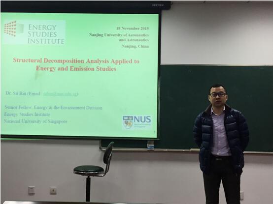 11月18日上午10点,应能源软科学研究中心所邀请,新加坡国立大学能源研究所高级研究员(Senior Fellow) 苏斌来我院交流并做了主题为“Structural Decomposition Analysis Applied to Energy and Emission Studies”的专题讲座。 讲座中苏斌分析了结构分解分析和指标分解分析两种方法的区别,并介绍了结构分解分析方法在能源经济和排放研究领域的主要应用情况。专题讲座结束后,在场师生和苏斌针对目前国际能源和排放问题研究领域中结构分解分析及其他研究方法进行了讨论。 据了解,苏斌主要研究领域为能源经济与政策、能源与气候变化、能源环境系统建模和分析。现任 Energy Economics (SSCI源刊) 期刊副主编,Reports on Economics and Finance 期刊编委,以及 30 多个国际期刊审稿人,包括 Nature Climate Change, Proceedings of the National Academy of Science of the United States of America, Energy Economics, Energy Policy, Ecological Economics, Applied Energy, Economic Systems Research 等。在国际期刊 Energy Economics, Ecological Economics, Energy Policy, Energy, Applied Energy, Economic Systems Research 等上发表 20 多篇能源和环境相关的文章。目前在新加坡能源研究所主持和参与多项能源环境相关的国内和国际合作研究项目,项目报告提交至新加坡环境与水资源部、贸易与工业部、外交部、气候变化秘书处、国家研究基金会等多个政府部门。 报告结束后,师生们踊跃发言和提问,就报告内容进行了详细探讨,报告会在热烈的讨论中圆满结束。