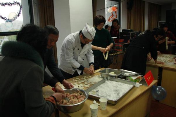 这次聚会以“包饺子”比赛为主题,其间穿插各种节目表演,场地里人头攒动,欢声笑语,热闹非凡。学院三个系和行政服务中心组成四个代表队,每队5人,参加了包饺子比赛。参赛选手在裁判员的一声令下,你追我赶,不甘示弱,大显身手。五名“吃货”评委在规定的时间以“速度快、形状美、味道佳”为标准,评选出了一、二等奖。新进教工自编歌词,倾情演绎的《经管欢迎你》拉开了演出的序幕,MBA中心选送的《惊鸿舞》、行政服务中心的舞蹈《卓玛》、二胡表演、学生赞助的《新疆舞》、退休老师的京剧保留曲目等,将现场的气氛一次又一次推向高潮。最后,老师们齐上阵,一起动手包饺子、煮饺子,当一盆盆热腾腾的饺子端上桌时,大家围着饺子,争先恐后地抢着,吃着,脸上洋溢着幸福的微笑。