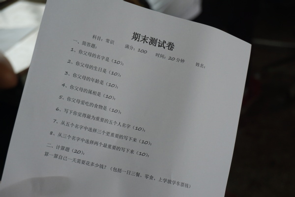 与其他支教项目不同的是,这次课上,支部同学为孩子们准备了一次考试。而这次考试,以爱之名。孩子们面对的考题几乎都是关于父母的问题,父母的生日,父母的喜好,完成这样几个看似再简单不过的问题,下面的孩子却面露难色,花了不少的时间。