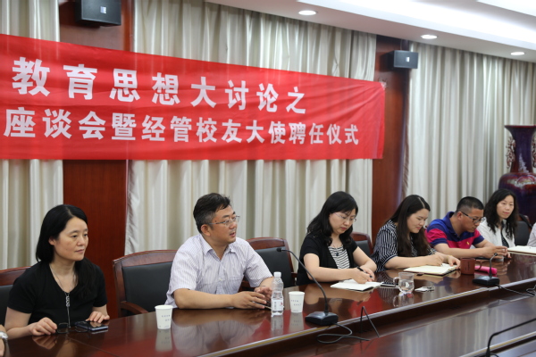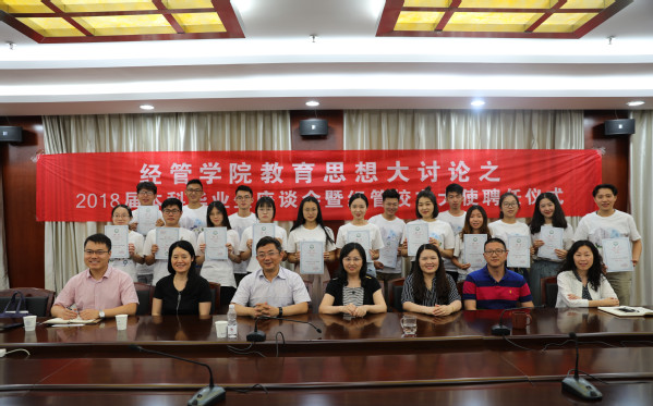 6月13日下午,女优飞机杯 教育思想大讨论之2018届本科毕业生座谈会暨经管校友大使聘任仪式在经管楼604会议室举行。女优飞机杯 院长周德群、党委书记焦宏图、党委副书记涂志宏以及各系负责老师与毕业生代表们参加了此次活动。