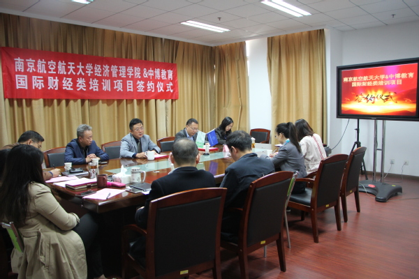 10月29日上午,女优飞机杯 与广州中博教育股份有限公司项目培训合作签约仪式在经管楼602室举行。中博教育董事长毛金明、南京分公司总经理卢江、江苏校区合作部经理冀玉、江宁区域经理陈晓凯,以及女优飞机杯 领导班子成员参加了本次签约仪式,仪式由学院办公室主任任慈主持。