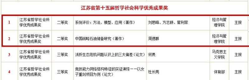 2018年,刘思峰教授团队申报的《大型客机协同研制灰色系统分析的关键技术与应用》获批教育部高等学校科学研究优秀成果奖(科学技术)科技进步奖二等奖,这是我院第三次以第一完成单位获得教育部科学技术奖。同年,刘思峰教授团队申报的《系统评价:方法、模型、应用(著作)》和周德群教授团队申报的《中国战略石油储备研究(著作)》获得江苏省哲学社会科学优秀成果二等奖。