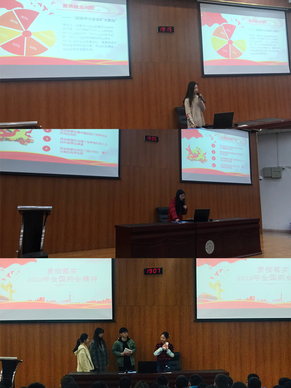 本次两会公开课的主讲人是17年级全体团支书。梦想公开课上,她们分别为同学们介绍了两会的基本概况、讲述了民生问题、解读了两会提案对民生问题的改善。短视频和ppt讲解相结合,让两会课堂不再枯燥;情景剧表演幽默风趣,让同学们在捧腹大笑中了解民生问题。这堂公开课,涵盖了教育、就业、医疗保障、反腐、食品安全等与老百姓切身利益息息相关的社会热点问题,以一种生动有趣的形式,拉近了同学们与全国两会的距离。