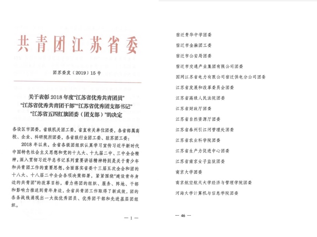 近日,共青团江苏省委发文表彰2018年度五四红旗团委、五四红旗团支部、优秀共青团员、优秀共青团干部。我院团委荣获“江苏省五四红旗团委”荣誉称号。