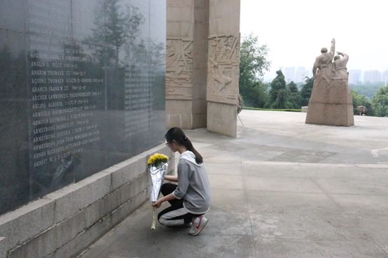 随后,全体同学怀着崇敬的心情,瞻仰了抗日航空烈士纪念碑,深切缅怀在抗日战争中为了抵御外敌入侵而英勇献身的航空英烈们。入党积极分子胡悦芝作为学生代表,向烈士们献上了寄托哀思、象征和平的菊花,她表示:“虽然这些空军英雄大部分没有留下生平事迹,甚至没有留下他们的相貌,但是就像历史上所有英雄一样,他们将永远被后人缅怀。身为南航学子的我们,应接过先辈们的火炬,不断加强政治理论和专业知识的学习,担负起历史赋予的责任,为我国航空事业的发展贡献自己的一份力量。”