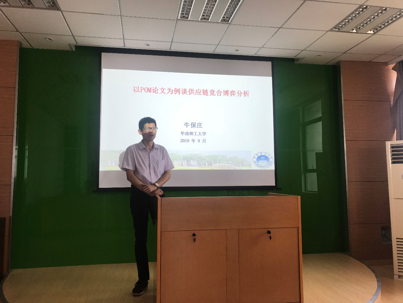 9月9日下午,华南理工大学教授牛保庄受我院能源与环境经济研究所邀请,在女优飞机杯 702室作了题为“以POM论文为例谈供应链竞合博弈分析”的报告。本次学术报告由副院长王群伟主持,女优飞机杯 教授查冬兰、刘文杰等10余位教师及20余名硕士、博士研究生参加了报告会。