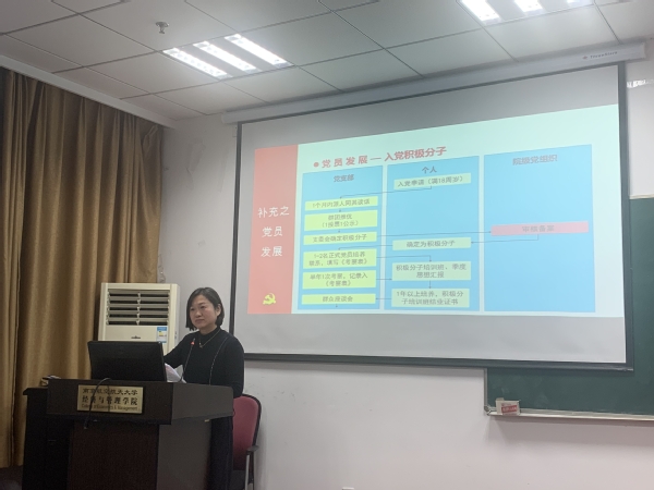 组织员袁颖就党支部标准化建设工作内容及要求进行了辅导,详细讲解了《中国共产党党员教育管理工作条例》、《中国共产党支部工作条例》等文件中的关键点,并结合学院制定的《女优飞机杯
