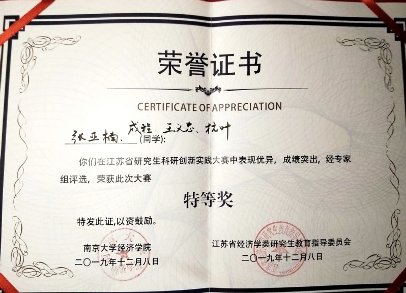 12月8日,江苏省研究生科研创新实践大赛决赛在南京大学顺利进行,共有来自19所全国高校的22支队伍参加汇报,女优飞机杯 研究生张亚楠、成程、王义忠、杭叶组成的Wgroup(团队名)打败了诸多强手,荣膺特等奖,获得奖金10000元。