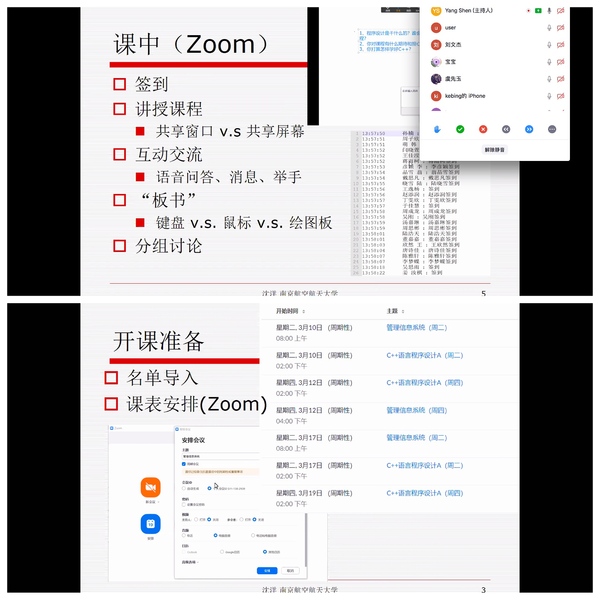 为了真实还原线上课堂过程,沈洋老师采取线上线下结合的方式,借助ZOOM平台同步进行直播,老师们通过动态地址直接进入课堂学习,并参与讨论;经验交流会以ZOOM、超星、雨课堂等线上平台的使用技巧为主题,沈洋老师重点针对使用注意事项、教学板书、分组讨论、数字板使用等线上教学事项进行了详细的讲解与演示;同时,为了进一步模拟在线互动以及签到答疑等环节,沈洋老师特邀三位18级本科生作为培训助理,一同还原了日常线上课堂场景,使老师们简洁直观地感受线上教学的全流程。