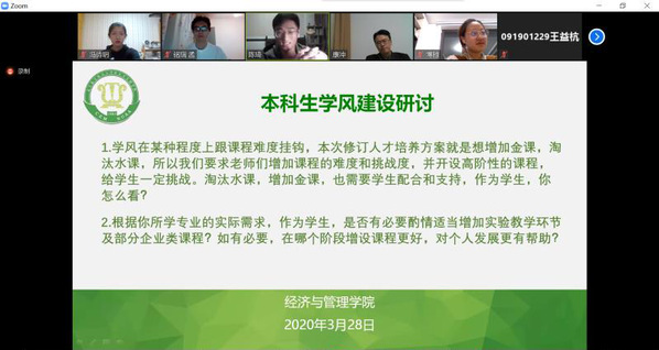 各班班主任纷纷肯定了班干部上学期扎实开展的各项工作对新生行为习惯养成、班风学风建设的积极作用,并进行了点评和指导:陆彪希望同学们充分认识到线上教学的特殊性,班干部应严把线上学习质量关,将线上课堂纪律及各项要求落到实处;王长波认为班干部工作热情、卓有成效,应在进一步助推班风建设及专业素养提升上下功夫;马晓平则从各个科目的成绩情况展开,分析了本学期的学习要点与高年级课程的关联,让同学们了解经管、提前谋划、积极准备。