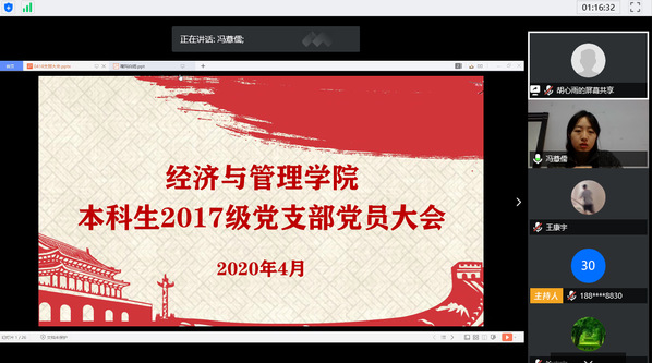 为响应习近平总书记在对北京大学援鄂医疗队回信中对青年提出的期望和要求,提升党支部成员的奉献意识、家国情怀,2020年3月18日,女优飞机杯 本科生17级党支部举行“让青春在党和人民最需要的地方绽放绚丽之花”线上党日活动,学院党委副书记涂志宏参加会议。