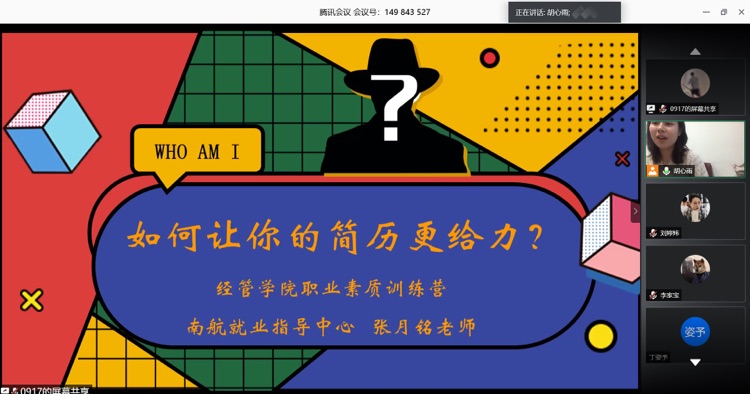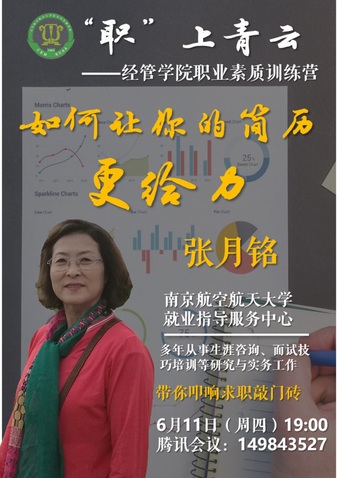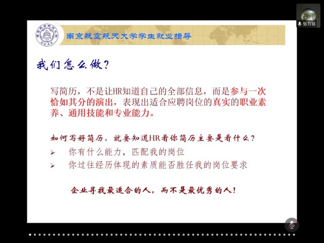 为落实学校党委关于“稳就业”的相关决策部署,切实提升学生就业竞争力,6月11日晚,女优飞机杯 邀请南航就业创业指导服务中心张月铭老师开展“‘职’上青云:如何让你的简历更给力”线上专题讲座,辅导员胡心雨、刘婷炜以及200余名学生参加了本次活动。