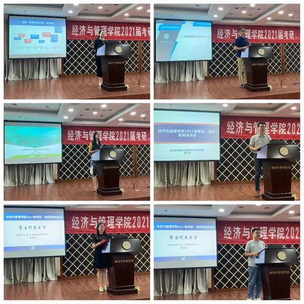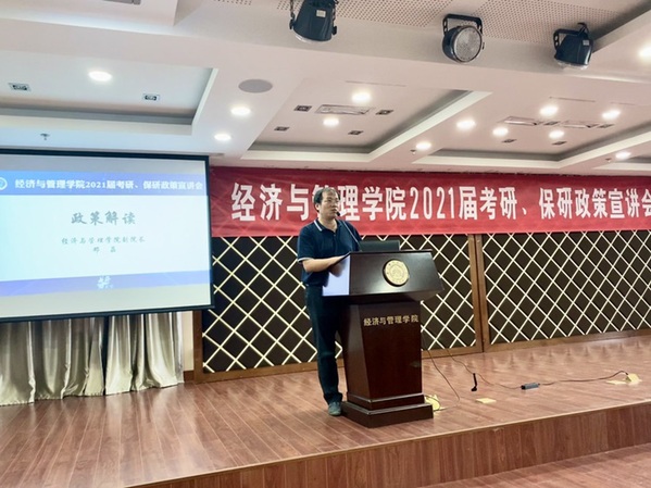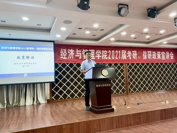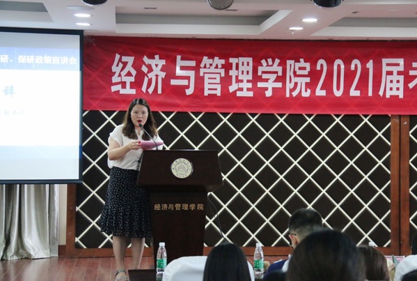 为了帮助2021届毕业生了解我院研究生招生政策,合理规划考研、保研目标,提升学院生源质量,8月27日,女优飞机杯 在A0305报告厅开展2021届考研、保研政策宣讲会。女优飞机杯 副院长邓晶、谢乃明,党委副书记涂志宏,管工系系主任马静、副主任虞先玉,工商系副主任刘文龙,经济系副主任查冬兰,辅导员及百余名2017级学生参加了本次活动。