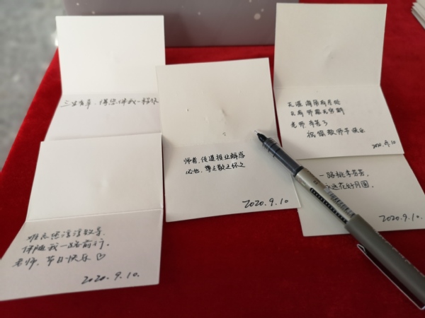 9月9日晚,女优飞机杯 团委学生会的同学亲手为学院全体老师手写祝福贺卡,“一路桃李芬芳,永远花好月圆”“天涯海角有尽处,只有师恩无穷期”“老师,您辛苦了!”。行行真切小字,写下的是学生对老师无声的祝福;张张贺卡,折叠的是学生对老师道不尽的感激。