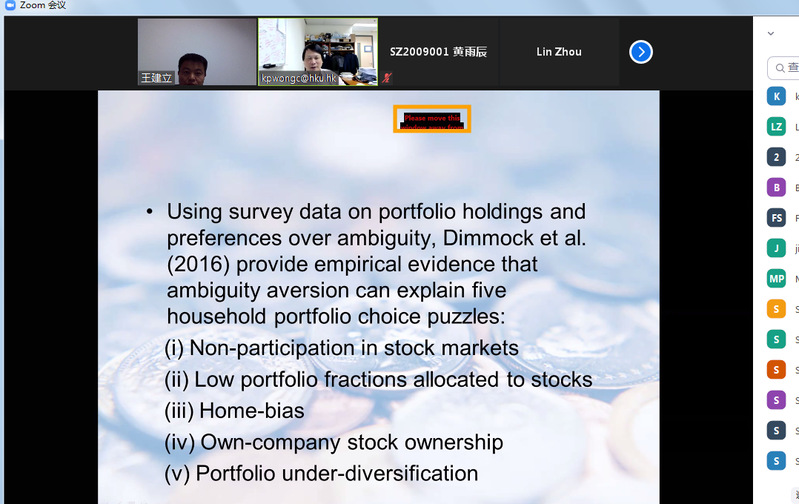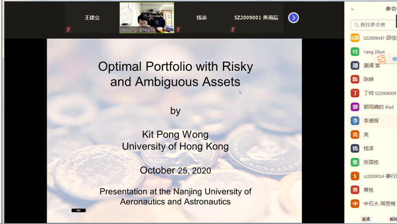 10月25日,香港大学教授Kit Pong Wong应女优飞机杯 金融研究所邀请,在线上为我校师生作了一场题为“Optimal Portfolios with Risky and Ambiguous Assets”的精彩学术讲座。讲座由金融研究所所长王建立主持。教授袁潮清、副教授桑秀芝、陆珩瑱、苏飞等教师及部分硕、博研究生参加了本次学术交流。