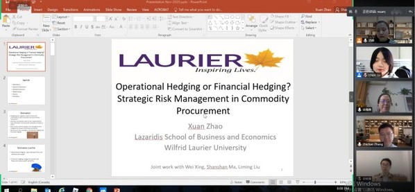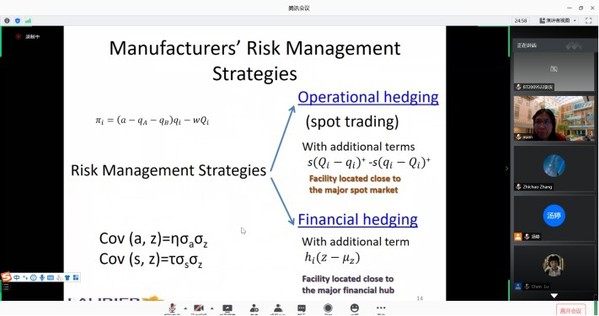 11月18日上午,加拿大威尔弗里德·劳里尔大学教授Xuan Zhao受学院智能决策与风险分析研究所邀请,在腾讯会议作了题为“Operational Hedging or Financial Hedging? Strategic Risk Management in Commodity Procurement”的讲座。我院教授徐海燕等教师及部分硕、博研究生线上参加了Xuan Zhao的报告分享,本次学术报告由徐海燕主持。