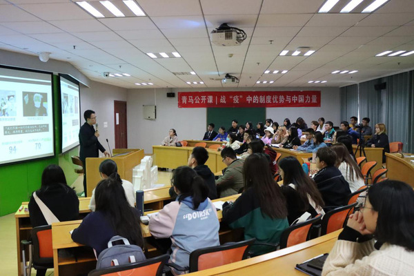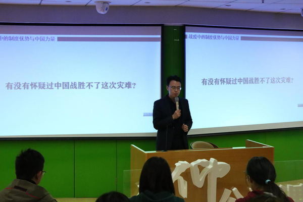 首先,康冲用“有没有怀疑过中国战胜不了这一灾难”的问题引发同学们对拥有“中国信心”的思考,并由此引出对于中国的体制优势、经济优势、文化优势的深入阐释。