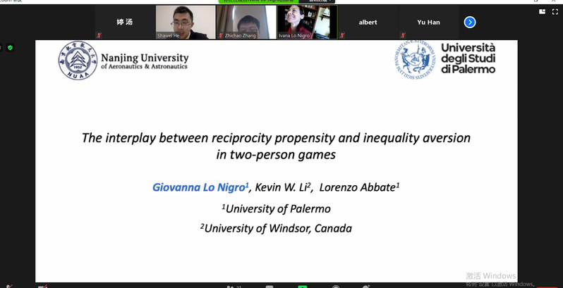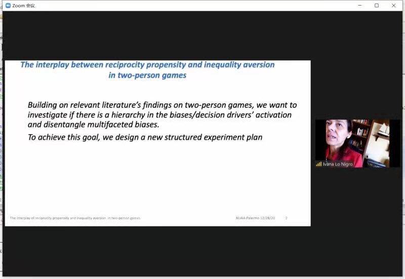 12月28日下午,意大利巴勒莫大学教授Giovanna Lo Nigro受学院智能决策与风险分析研究所邀请,在ZOOM会议作了题为“The interplay of reciprocity propensity and inequality aversion in two-person games”的学术报告。我院徐海燕教授、何沙玮副教授等教师及部分硕、博研究生线上参加了Giovanna Lo Nigro的报告分享,本次学术报告由何沙玮主持。