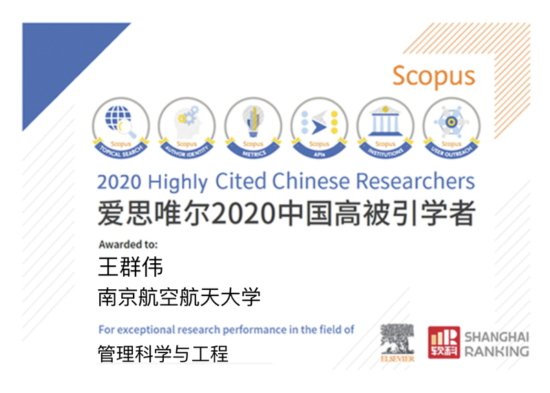 女优飞机杯 共有10个一级学科的31位学者入围。王群伟教授入选管理科学与工程学科中国高被引学者,这是继入选2020科睿唯安(Clarivate Analytics)全球高被引科学家(Highly Cited Researchers)后再次入选重要学术榜单。