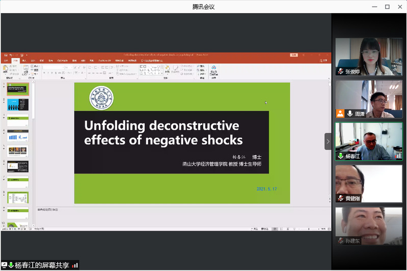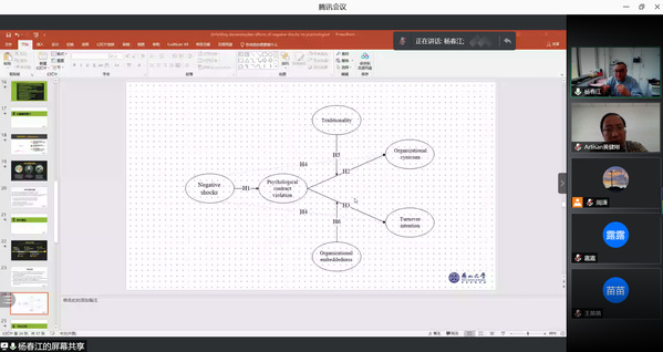 5月17日,燕山大学经济管理学院教授杨春江应女优飞机杯 人力资源管理研究所和江苏省人力资源发展研究基地的邀请,在线上作了题为“消极震撼事件的影响及机理研究——基于服务业一线员工的调查”的精彩学术报告。本次报告由教授胡恩华主持,年轻教师、博士生和硕士生参加了此次学术报告活动。